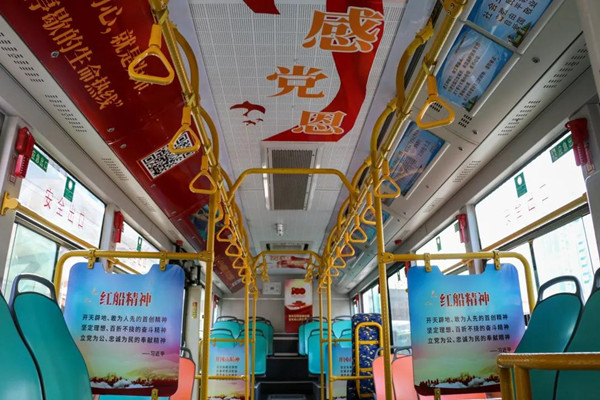 “永遠跟黨走、同心共乘去追夢”公交主題專線選用25路線全線30輛公交車進行打造,車身外觀以紅色為主色調(diào),融入建黨100周年圖標和“奮斗百年路、啟航新征程”“學(xué)黨史、悟思想、辦實事、開新局”等宣傳標語,營造出建黨100周年和黨史學(xué)習(xí)的濃厚氛圍。