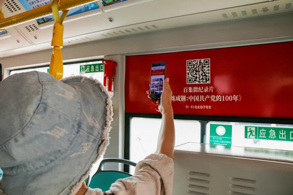 車廂內(nèi)利用前、后門的擋板展示重溫“紅船精神”“井岡山精神”。另外,通過聯(lián)合南寧云—南寧新聞網(wǎng)利用融媒技術(shù),設(shè)置了“南寧津頭走出的傳奇故事”“我的入黨故事”等紅色主題宣傳板塊,乘客們通過微信掃描車廂內(nèi)二維碼,可以觀看100部黨史紀錄故事,可以了解革命先烈雷經(jīng)天的傳奇故事,聆聽南寧市各行業(yè)100名優(yōu)秀黨員的入黨故事,還可以登錄黨史學(xué)習(xí)教育官網(wǎng)關(guān)注黨史教育,進行電子閱讀。車廂頂部“感恩黨,跟黨走”的醒目大字,更是讓乘客一上車就感受到濃厚的黨史學(xué)習(xí)氛圍。